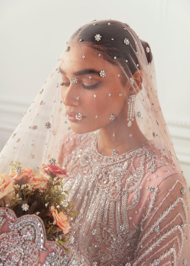Gown: Designer Embroidered Blush Pink Indian is embellished with dabka, stones, tilla, pearls, and thread work. The long maxi has fully embellished sleeves and a neckline. The dabka work looks stylish and perfect for any wedding occasion. Its front and back are embellished with tilla, dabka embroidery. The fabric used for this is tissue organza. Introducing a traditional pink long maxi emblazoned with pretty silver stones works on the whole maxi. It is combined with sequins and Aari works with handwork all over the maxi in blush color. The maxi is beautified with marvelous work. The fabric used for the maxi is a chiffon net.