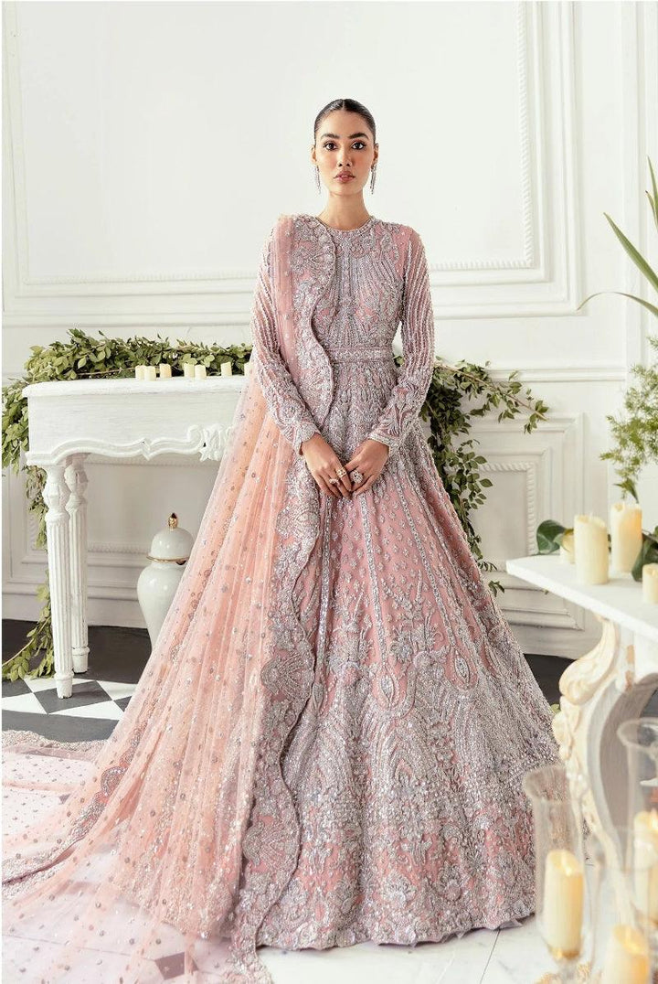 Designer Embroidered Blush Pink Indian Outfit is embellished with dabka and hand-embellished thread work. This traditional bridal maxi is best for your wedding event. This pretty long frock has a glamorous outlook and embellished work of silver stones that is the perfect combination for your big day. Buy this maxi online for your beautiful day to make it more memorable.