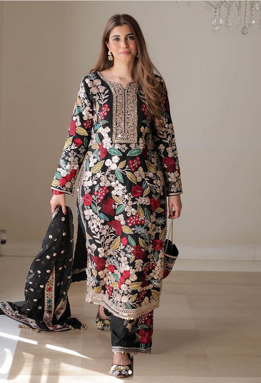 Indulge in the luxury of Haseen's Mehnaaz Black Luxury Lawn Collection. This 3 piece unstitched set from Pakistan features delicate and intricate lawn fabric, providing the perfect canvas for any fashion masterpiece. Elevate your wardrobe with this exclusive and sophisticated collection.