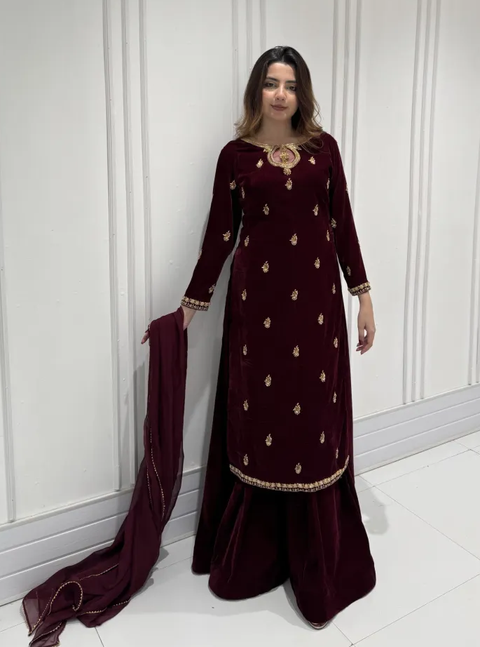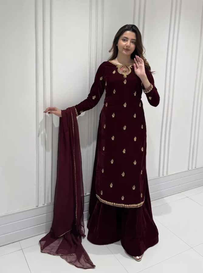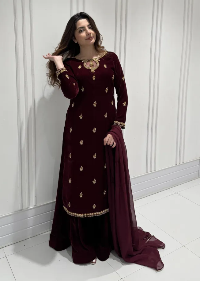 Elevate your wardrobe with the Poshkari Solid Maroon Embroidered Velvet Unstitched 3 Pc Suit in Royal Aura. This luxurious ensemble features rich maroon velvet fabric adorned with intricate embroidery, offering timeless elegance for special occasions. The unstitched format allows you to customize the fit perfectly to your preferences, ensuring comfort and style tailored just for you. Ideal for weddings, celebrations, and formal gatherings, this three-piece suit combines traditional craftsmanship with contemporary design. Transform this premium fabric into your dream outfit with a tailor of your choice.