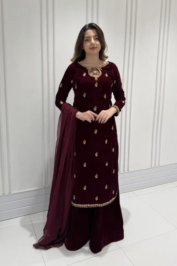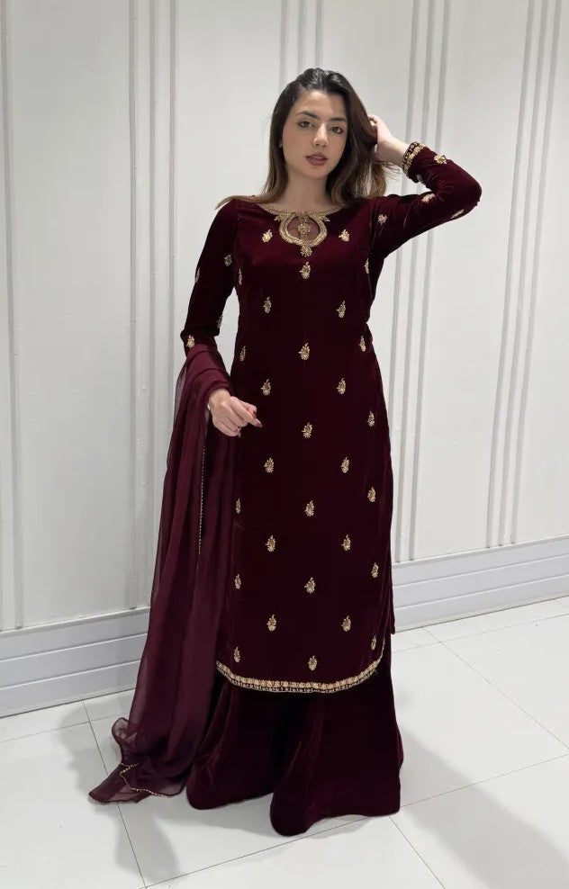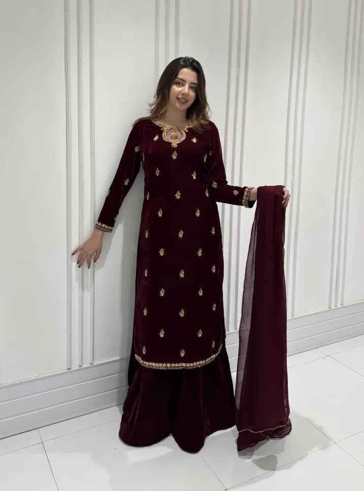 Poshkari Solid Maroon Embroidered Velvet Unstitched 3 Pc Suit ROYAL AURA