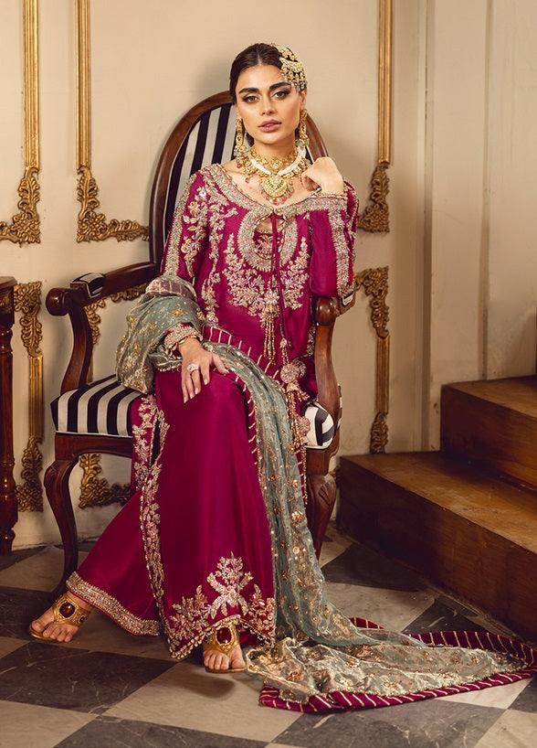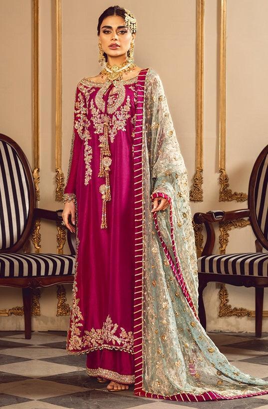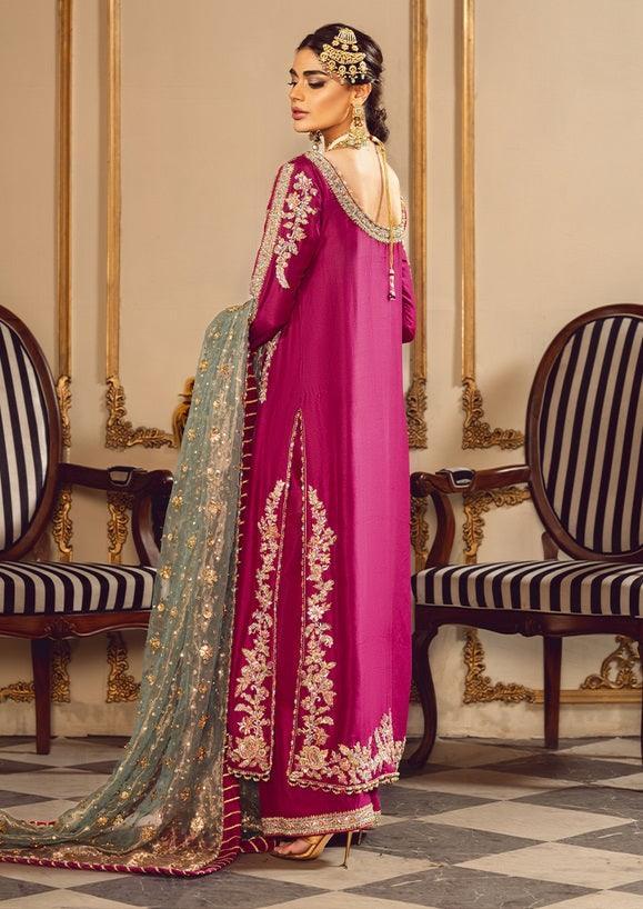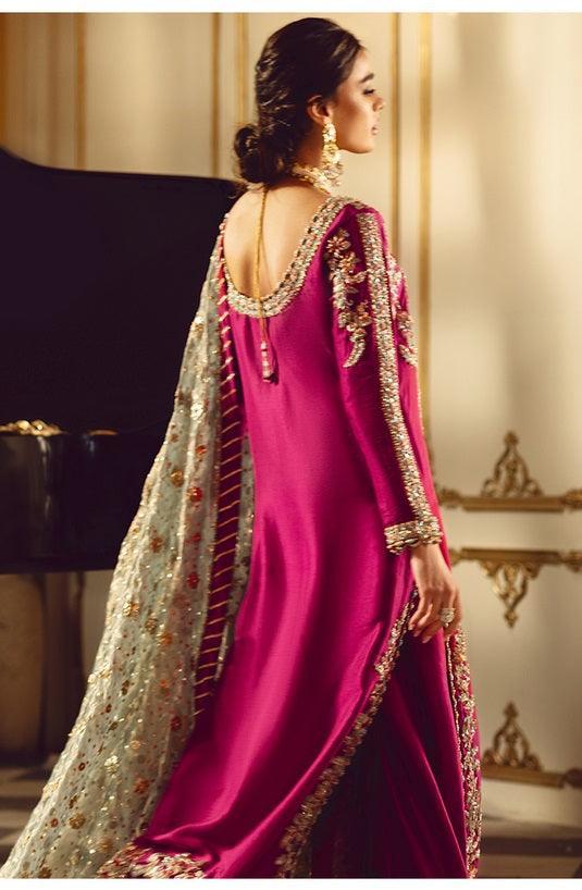 A symphony of opulence crafted from pure raw silk. Radiating a lustrous sheen and luxurious texture, the shirt and pants are paired with an aqua green dupatta, inviting you to embrace enchanting color and texture. This ensemble harmoniously blends modern spirit with traditional richness, celebrating individuality and style. Each element forms a harmonious composition, resonating with elegance and allure